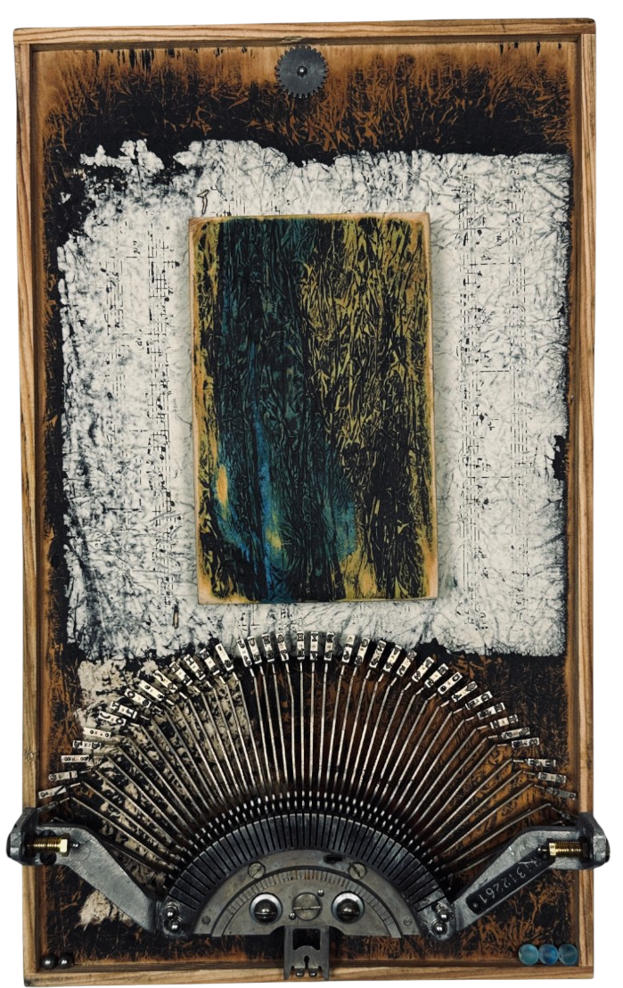 Kharris Brill, Silent Storm, found object assemblage, 17 x 11 x 1 in., 2025.